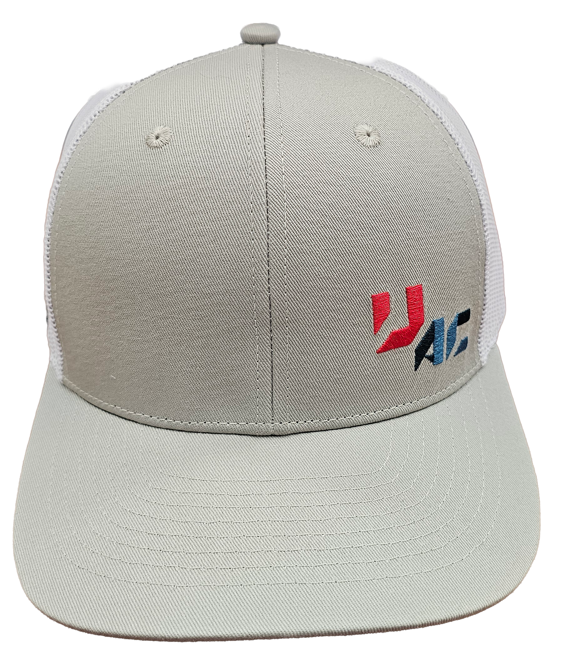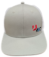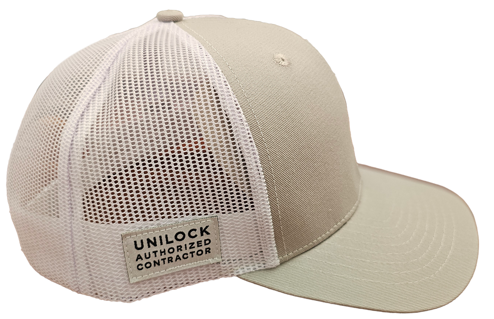 Structured 6-panel with pre-curved visor, light grey chino twill, white rigid mesh back panels with plastic adjustable closure. UAC logo on the front lower left corner, Unilock Authorized Contractor patch on right temple.
